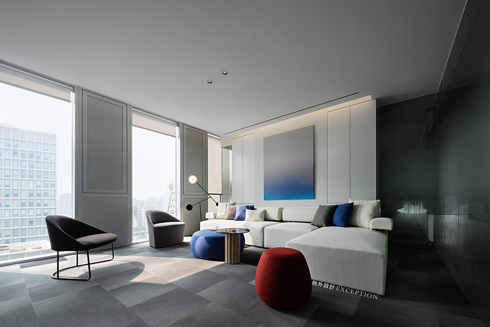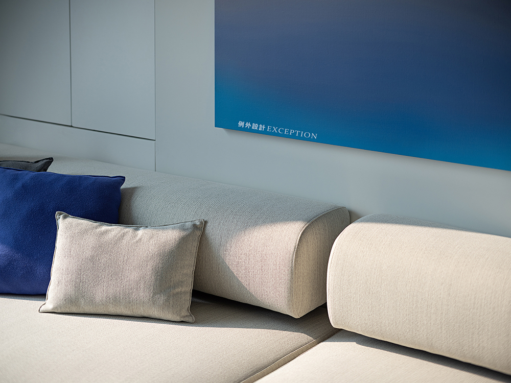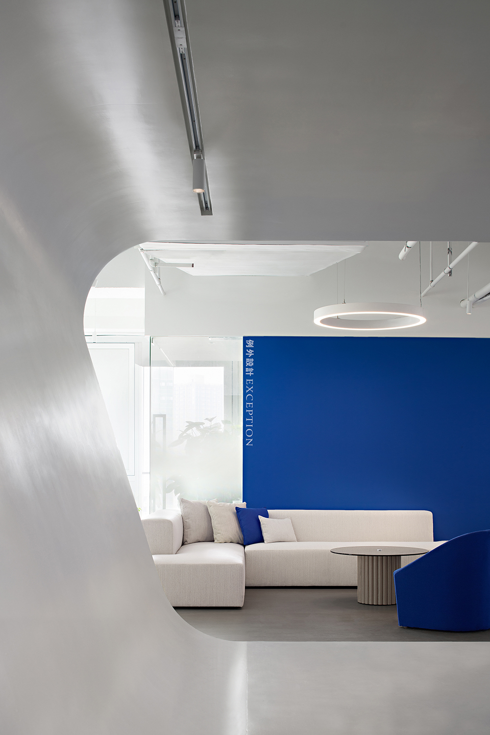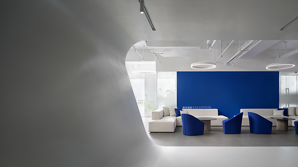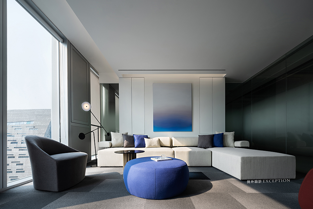 開放式接待區(qū)在形色之間創(chuàng)造出一種輕松明亮的等候氛圍,純凈的克萊因藍(lán)是是一切夢(mèng)想的開端,隨時(shí)靜候靈感的噴薄而出。對(duì)稱L型沙發(fā)勾勒出沉浸式多人溝通互動(dòng)的場(chǎng)景,在當(dāng)下延伸出對(duì)未來的思辨與創(chuàng)想。