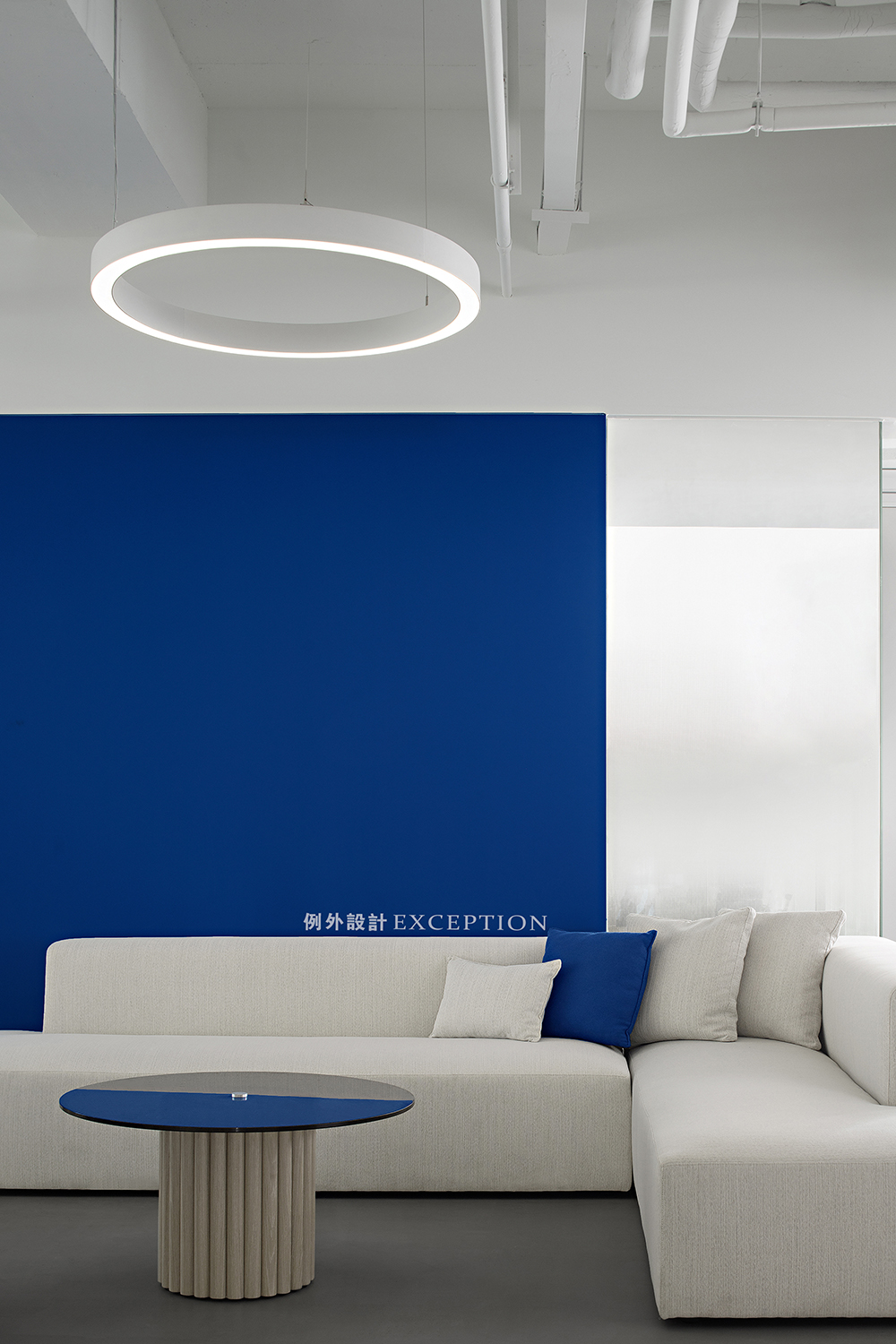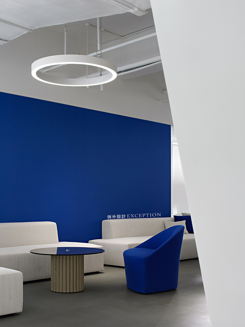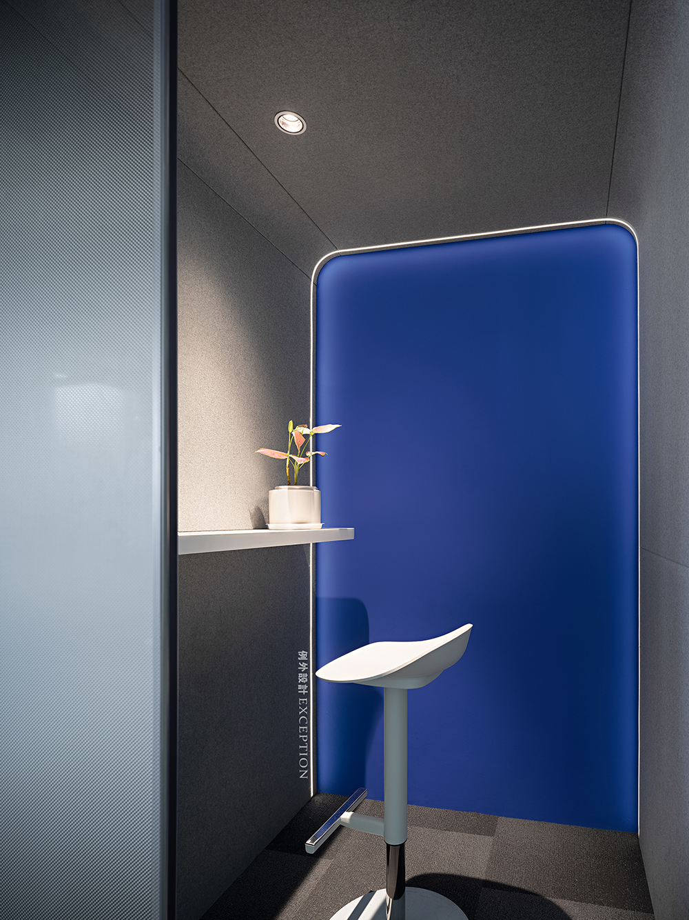 開放式接待區(qū)在形色之間創(chuàng)造出一種輕松明亮的等候氛圍,純凈的克萊因藍(lán)是是一切夢(mèng)想的開端,隨時(shí)靜候靈感的噴薄而出。對(duì)稱L型沙發(fā)勾勒出沉浸式多人溝通互動(dòng)的場(chǎng)景,在當(dāng)下延伸出對(duì)未來的思辨與創(chuàng)想。