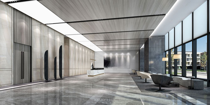電梯廳的設計圍繞著檔次來展開,所以目極所處都是石材的身影,縱橫相間的線性排布營造出嚴謹有序的空間氛圍。