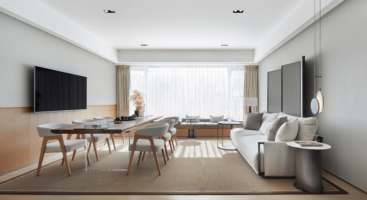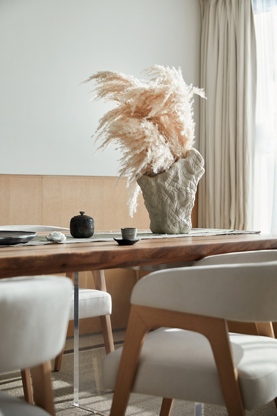 設計師徐靜充分考慮了業主行業沙龍、閨蜜下午茶、料理烘焙等個性化需求,織物與木質的完美組合,自然而質樸,在不斷變幻的光線中,設計成就了迷人的色彩美與律動美。