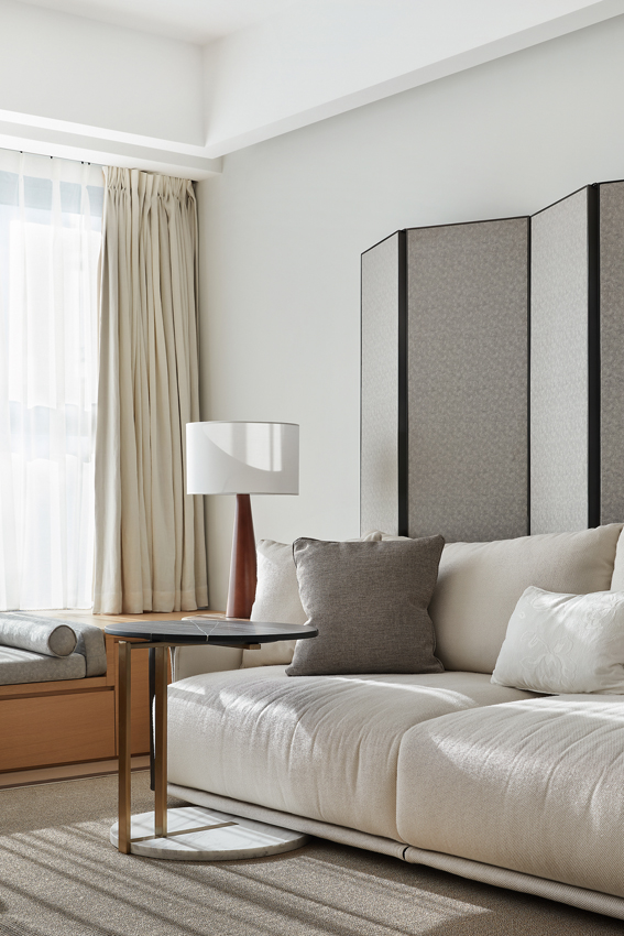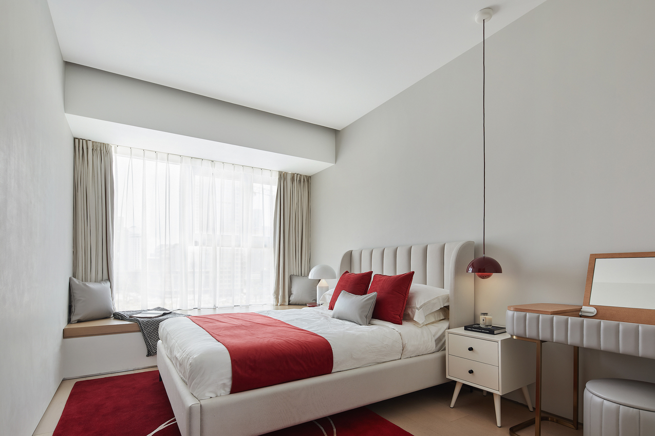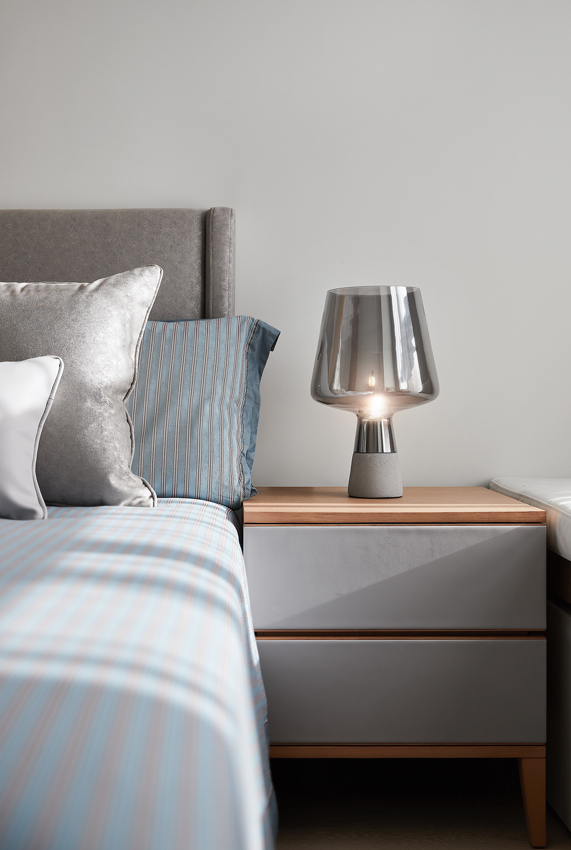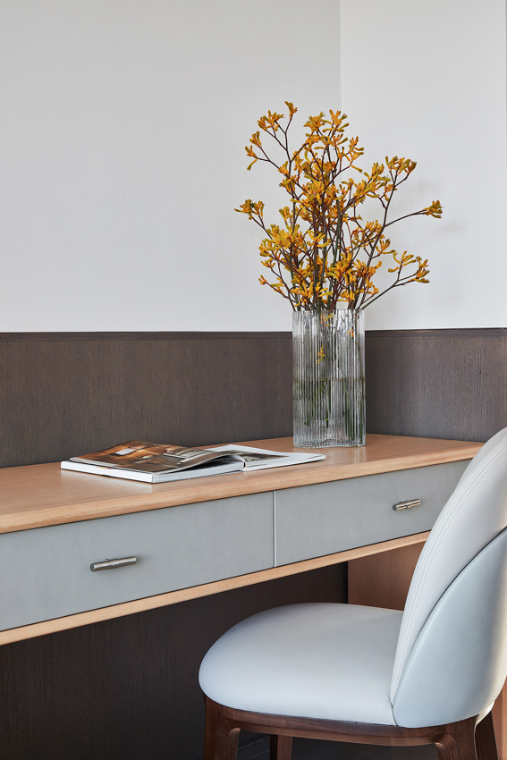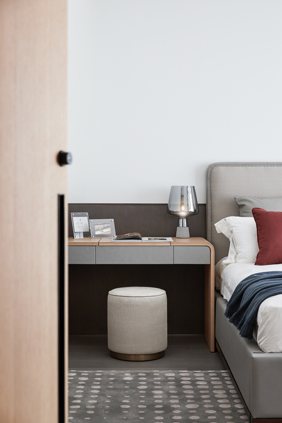 海德格爾說:“詩意的棲居,不應該只是觀看的詩意,而是居住的詩意。”設計通過深淺不一的灰色打造舒適奢享的空間氛圍。富于肌理與光澤的床品、造型精巧的臺燈,窗臺小憩的休閑場景,都經過設計師精心的考量,為居者呈現定制化的品質體驗。