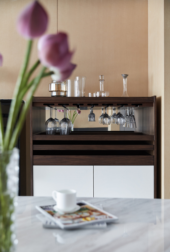 在設計師徐靜看來,當設計更多地在審視空間的互動性和人的參與感時,便有了家的人情味。開放式餐廚布局增加了更多互動的場景感,女兒心愛的鋼琴與簡雅實用的酒柜倚墻而設,將每一寸空間利用到極致,藝術與生活于此實現了潤物無聲的自然交融。
