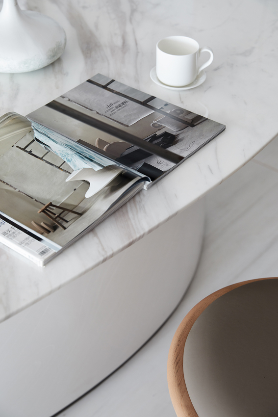 能為幸福的家錦上添花,是設計師對空間最虔誠的致意。如輕舟般翩然的島臺是設計師徐靜的特別創作,隱藏式的收納,明凈的視感,自然的石材肌理,配合游刃自如的空間情境,素雅輕靈,滿含著三餐四時的生活哲學。