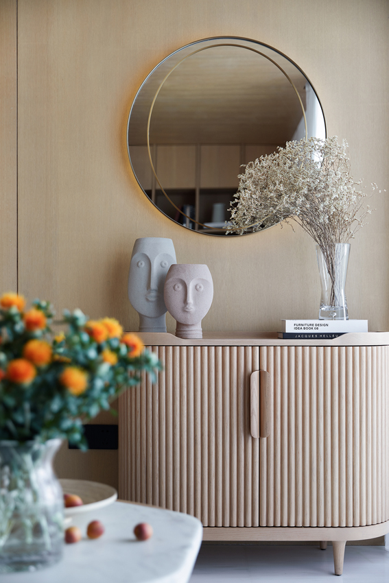 在休閑區,設計師更注重關照居者內心的情感訴求和個性表達,讓家真正成長為夢想中的美好國度。淡雅木色通體式書櫥延續了空間素樸文雅的視像,弧形沙發與現代簡約形制圓形茶幾,肌理中流露著歲月靜好的閑適意趣。