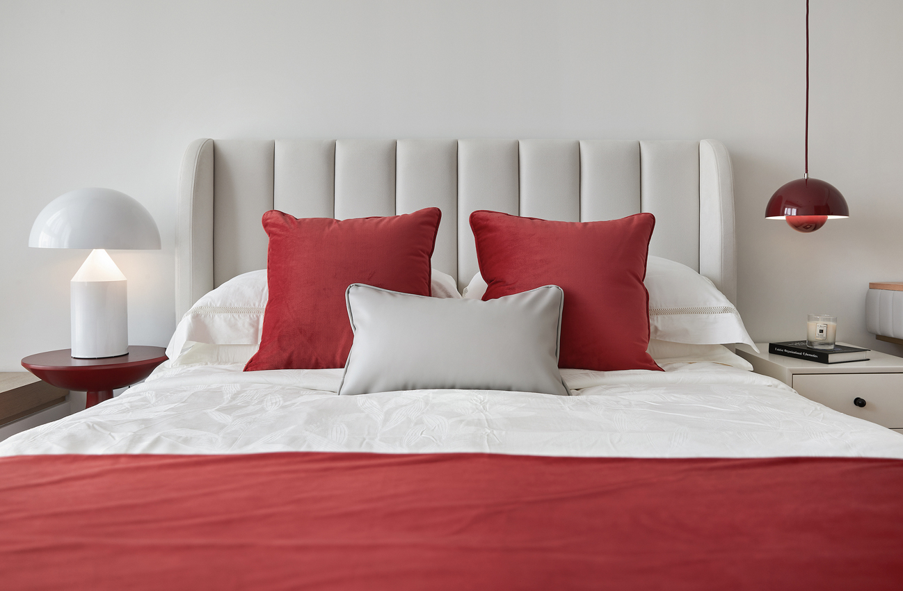 從審美品位到材質把控、風格定位的選擇上,設計師徐靜始終在不斷探求更加美好的設計呈現。光影隨意灑落于床邊,與精心調配的典雅藍和復古紅搭配出簡寧質感。適度留白給予居者更多的想象,在未來的日子里,用愛與品位去慢慢填滿。