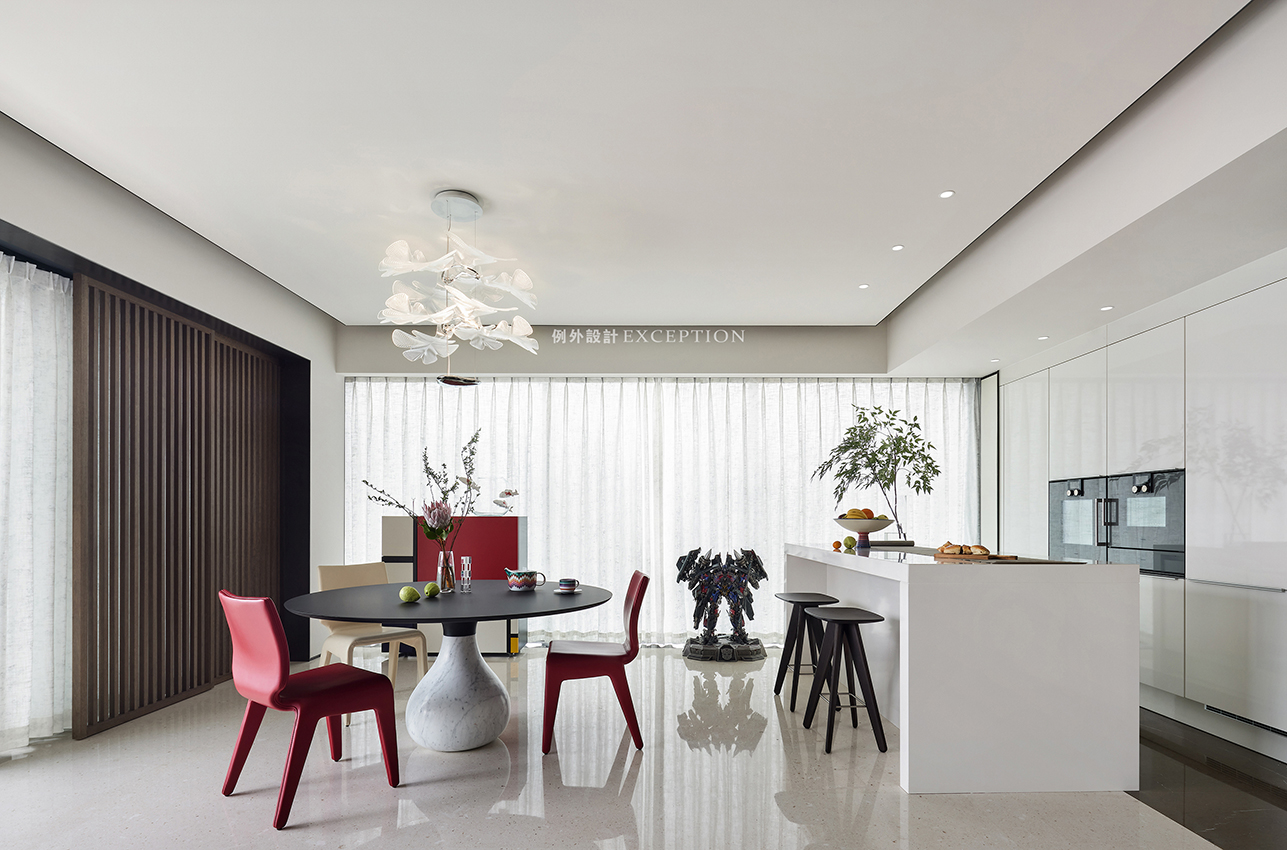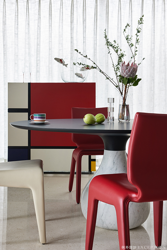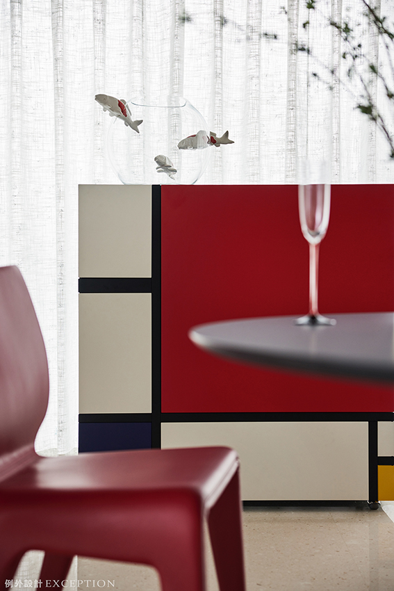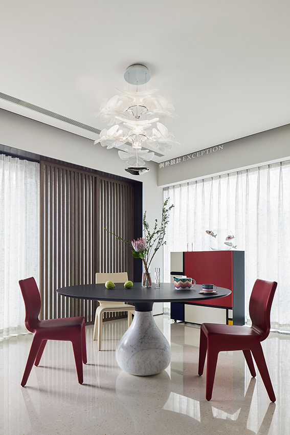 蒙德里安經(jīng)典的紅黃藍白元素融入餐邊柜的創(chuàng)意中,成為餐廳一隅的經(jīng)典。紅白相配的皮質(zhì)餐椅圍合黑白拼接的水滴形餐桌,豐富了家人三餐四時的藝術享受。雅白花朵吊燈更是將這一氛圍烘托得更加濃郁、澄澈。格柵屏風朦朧中透露詩意,空間強烈的色彩所調(diào)和的韻律感,成為讓人深情迷戀的所在。