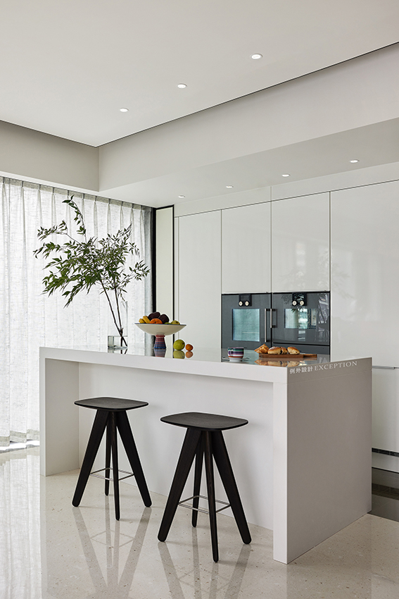 在一片純白的視像中,設計抽離了多余的表達,留白更多驚喜迎接居者的創(chuàng)造。夫妻倆的獨處時光,制造彼此心領神會的浪漫,默契在空間游走,陽光隨薄紗流轉(zhuǎn),藝術成為空間里流動的一道人文風景。