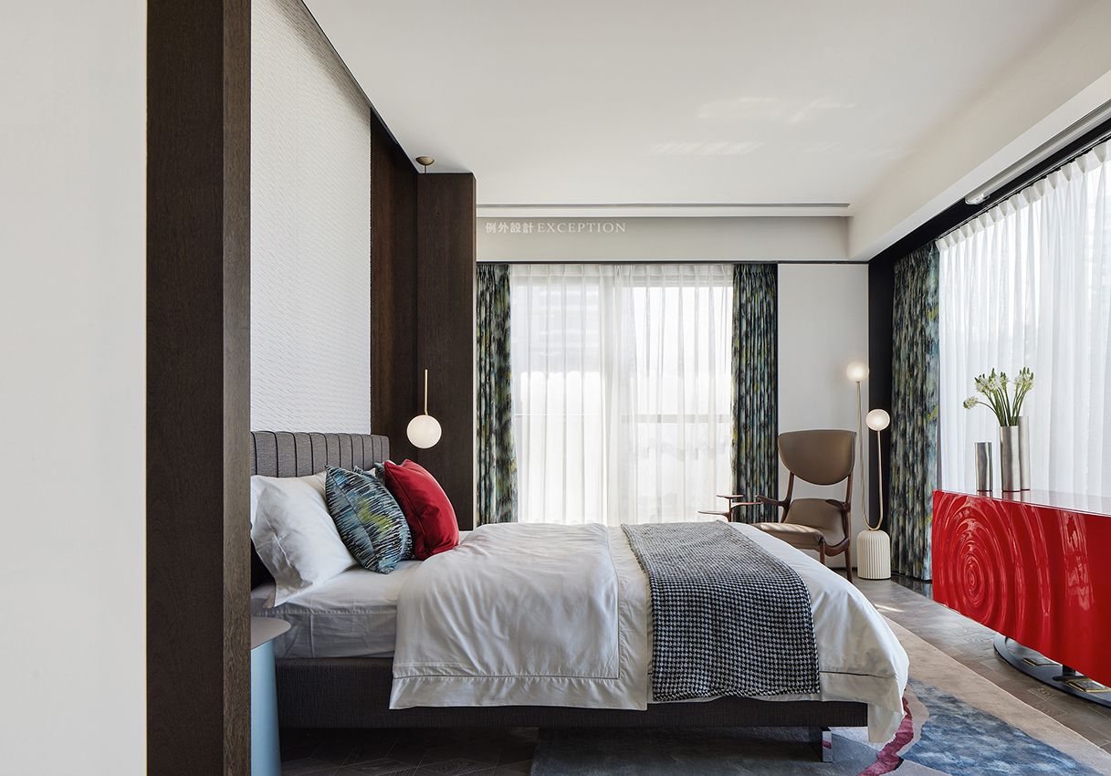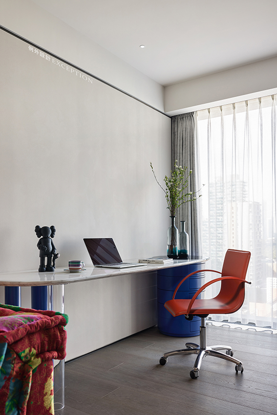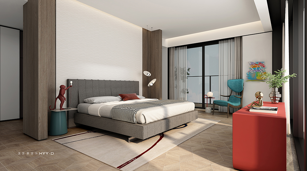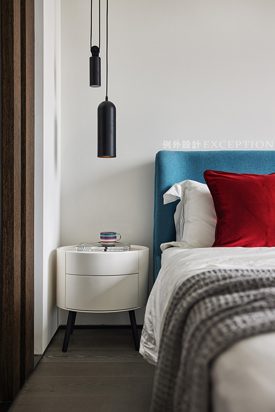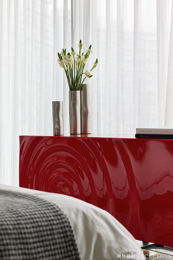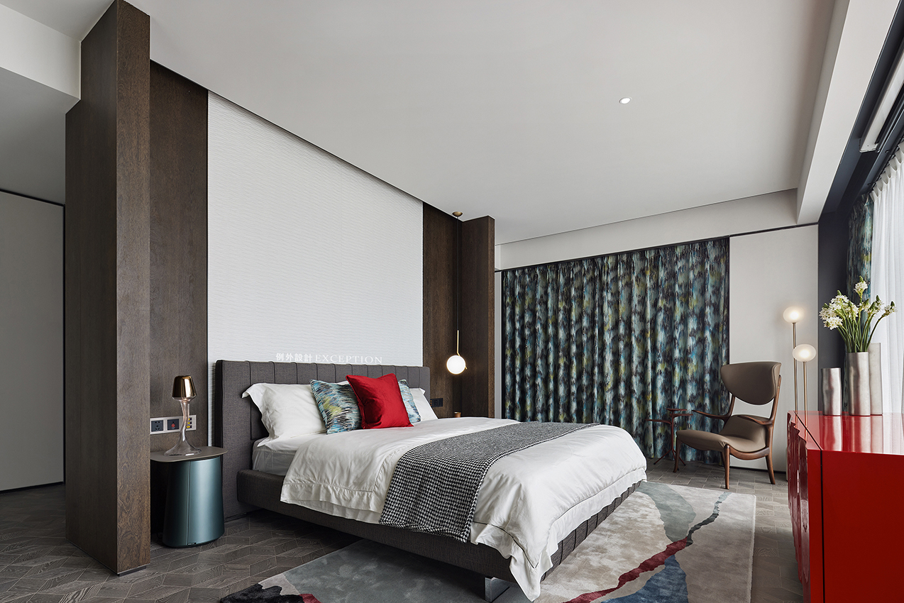 主臥延續(xù)玄關空間的藝術線索,床頭墻面白色群魚自在暢游,紅色裝飾柜一圈泛起的漣漪將思緒拉進自然的呼吸中,再次強化了如魚得水的靈感設想。作為一個私享的休息空間,一部會心的電影,一次深入的暢談,生活的浪漫情調(diào)都會生發(fā)于此,余韻悠長。
