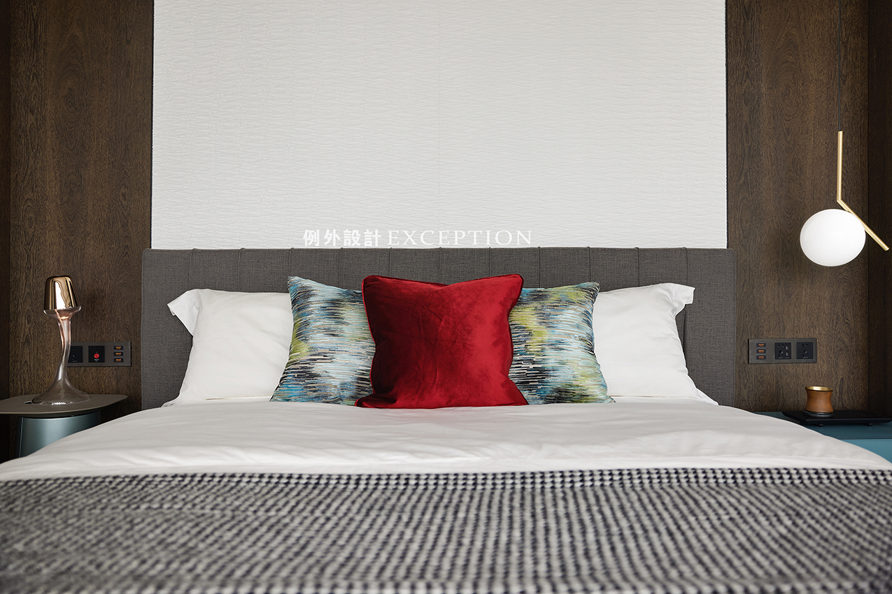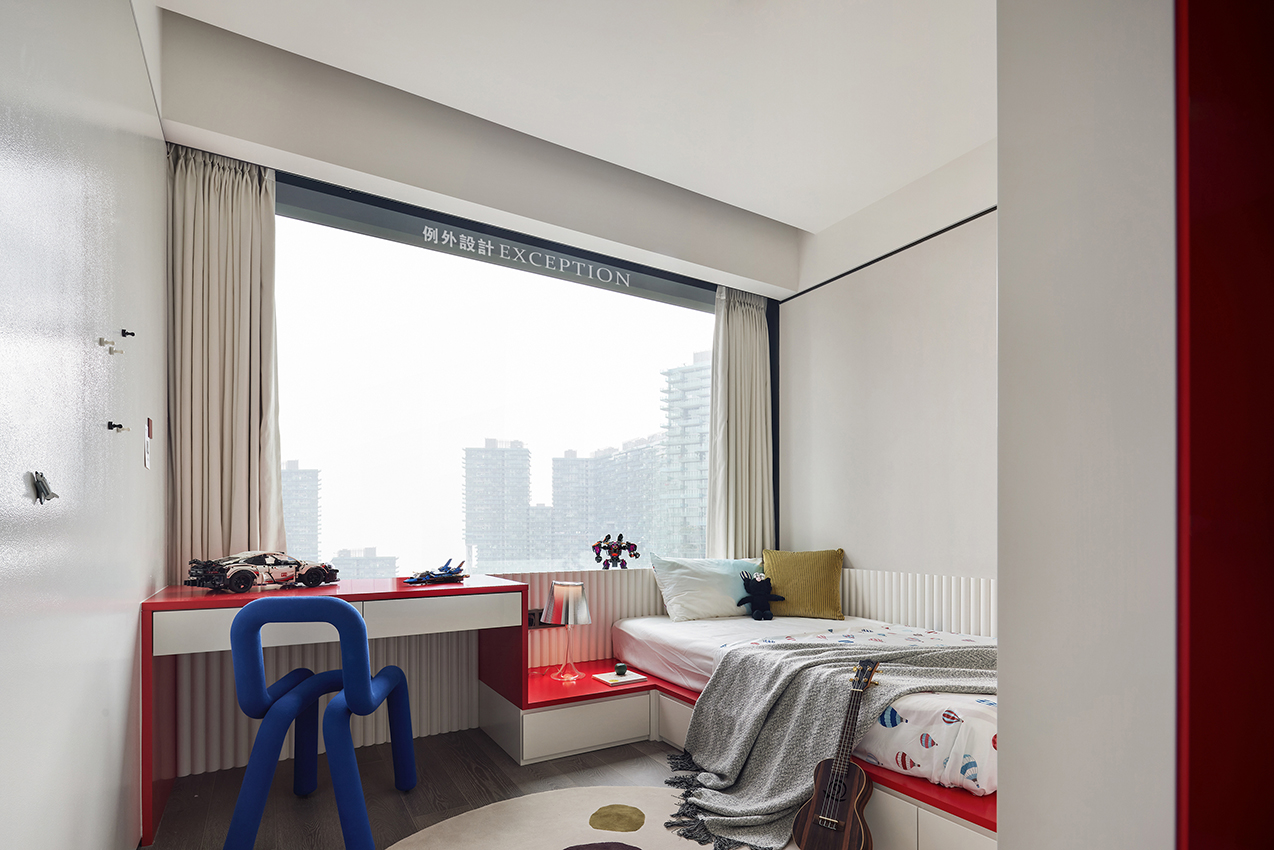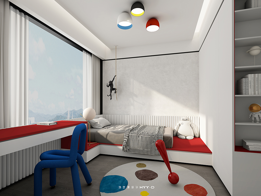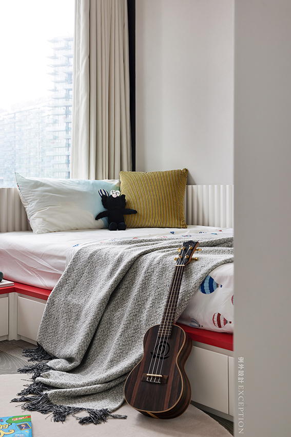 主臥延續(xù)玄關空間的藝術線索,床頭墻面白色群魚自在暢游,紅色裝飾柜一圈泛起的漣漪將思緒拉進自然的呼吸中,再次強化了如魚得水的靈感設想。作為一個私享的休息空間,一部會心的電影,一次深入的暢談,生活的浪漫情調(diào)都會生發(fā)于此,余韻悠長。