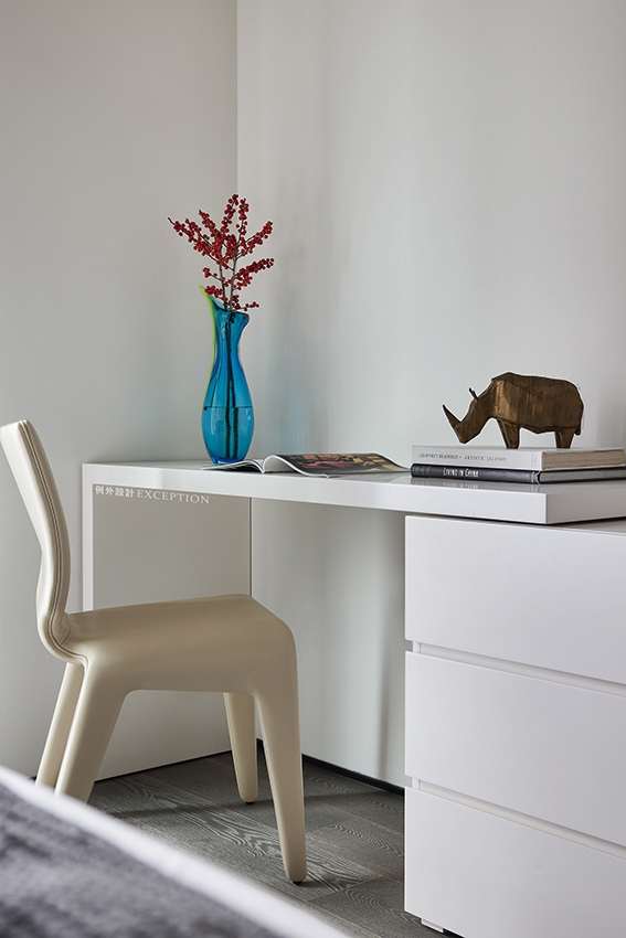 長輩房去繁就簡,通過米白的家具和床品營造干凈純粹的清韻。祥和喜樂的紅色搭配雅致的藍色,加上小巧的飾品,寥寥數(shù)筆就勾勒出藝術而不失生活氣息的空間氛圍。
