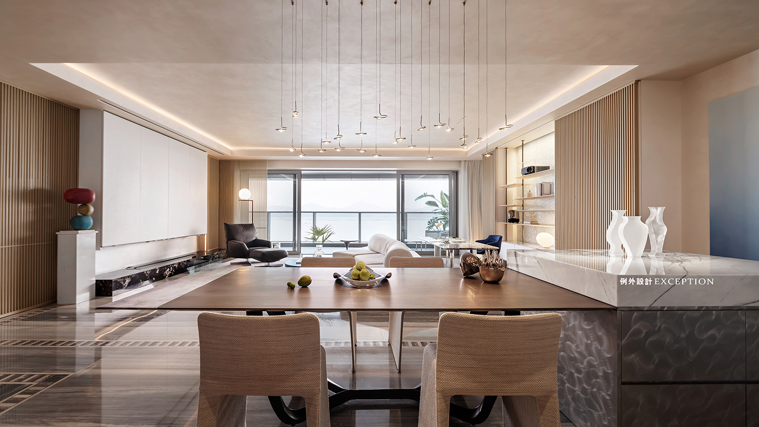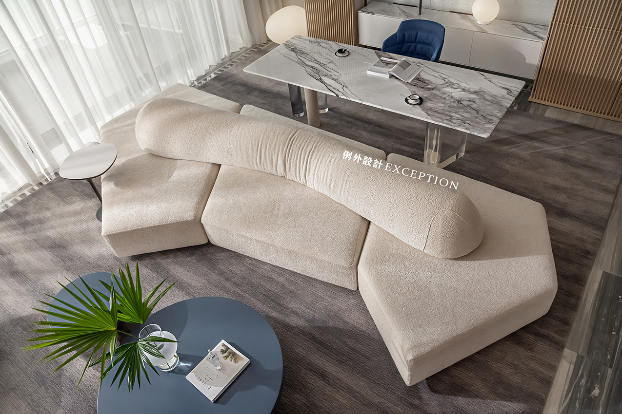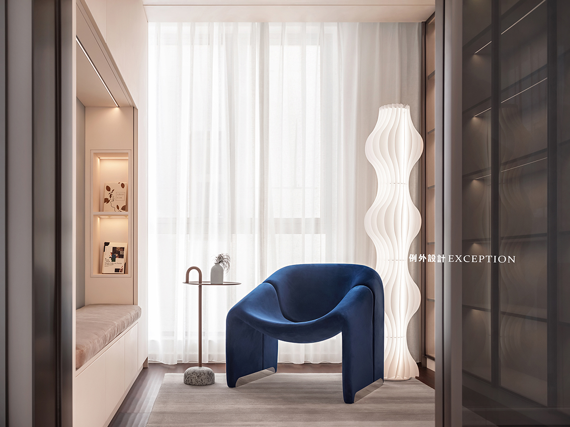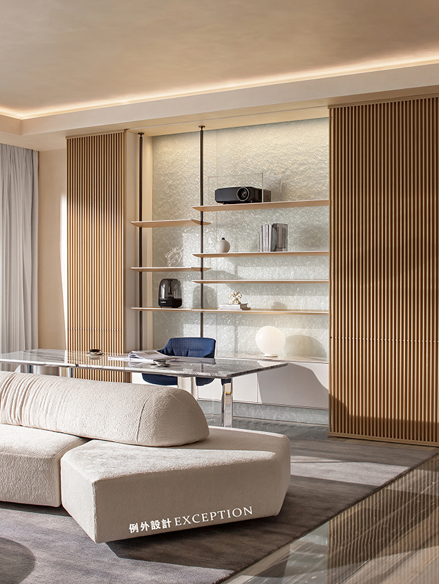 當(dāng)滿目海景遇上懂生活的人,空間的故事又多了一層韻味。雙向而立的沙發(fā)成為客廳和書(shū)房功能的鏈接,創(chuàng)造出更加豐富的生活場(chǎng)景。家人可以一起看電影、紀(jì)錄片,一旁的閱讀區(qū)也是放松身心的不錯(cuò)選擇,或者在單人椅側(cè)目而望,光影與自然,人情與況味,在這里靜靜交織。