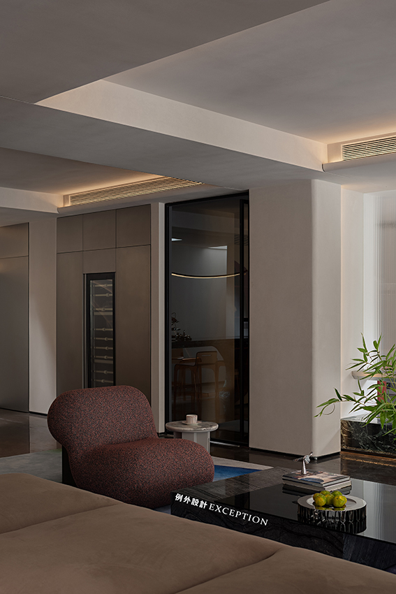 靈活的設(shè)計(jì)可以還原生活自由的本質(zhì),生動(dòng)的居住場(chǎng)景源于對(duì)真實(shí)生活的精準(zhǔn)洞察。會(huì)客區(qū)結(jié)合原結(jié)構(gòu)柱體增加懸空地臺(tái),與沙發(fā)巧妙配搭,詮釋了暢達(dá)舒適的空間感。鏤空區(qū)不僅關(guān)注到實(shí)用性,以不銹鋼收納柜和電子壁爐的形式具象了家的溫暖氣質(zhì),更成為一扇窗口,讓室內(nèi)與室內(nèi),室內(nèi)與室外形成了微妙而不疏離的聯(lián)結(jié),寥寥數(shù)筆便勾勒出屋主會(huì)客場(chǎng)景下的輕松與自在。