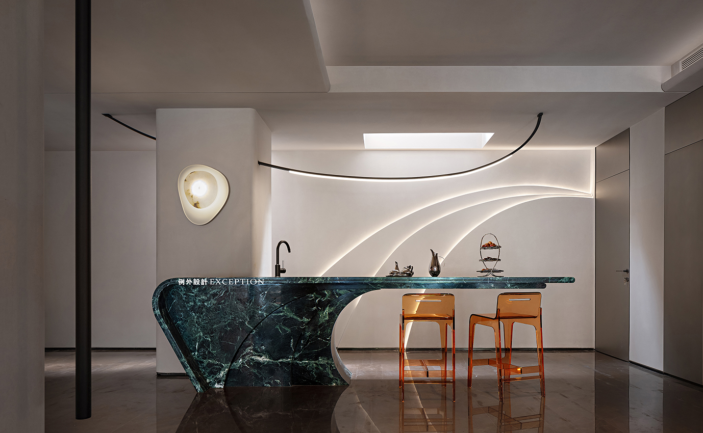 考慮到結(jié)構(gòu)限制,鴻藝源設(shè)計(jì)結(jié)合原有柱體做了超長(zhǎng)懸空的大理石個(gè)性化吧臺(tái),屋主可以在此小酌一杯。吧臺(tái)區(qū)石材壁燈表面印刻星球璀璨的紋理,和火星之家的主題無聲呼應(yīng)。弧形吊燈和墻面燈帶如夜空劃過的星軌,會(huì)客區(qū)的球形落地?zé)簦_啟后如明月升起,閉上眼睛想象,家化身為宇宙,隨時(shí)踏入一場(chǎng)星際漫游。