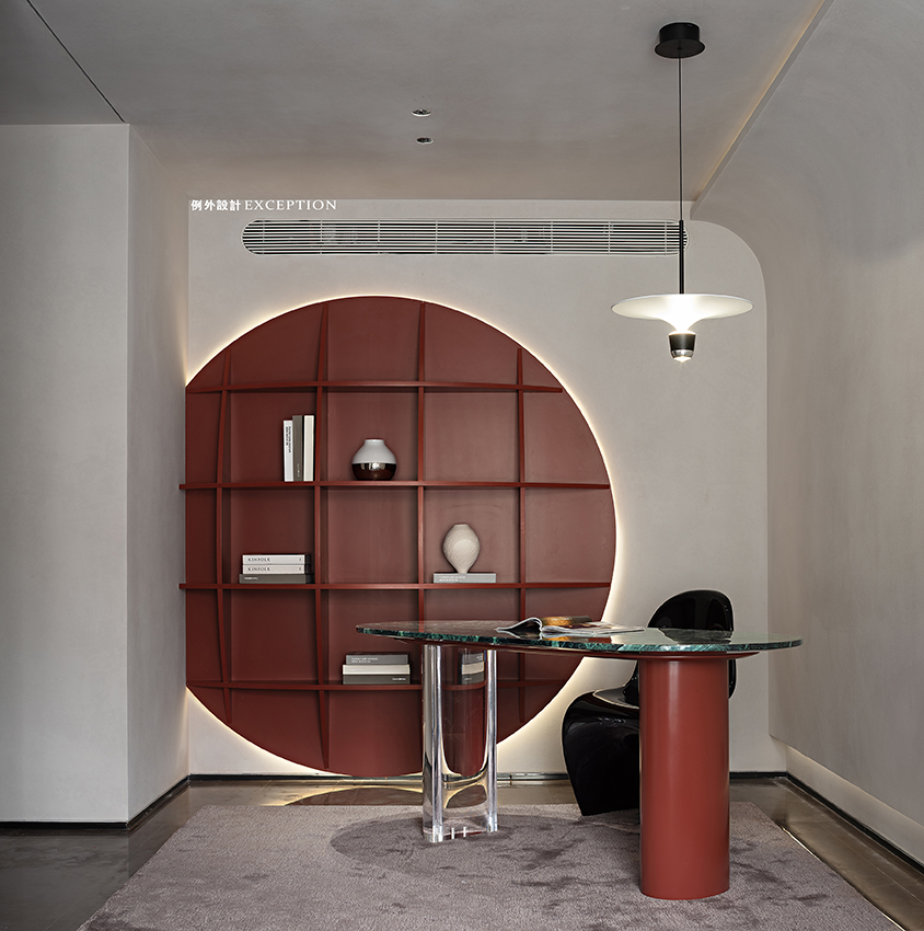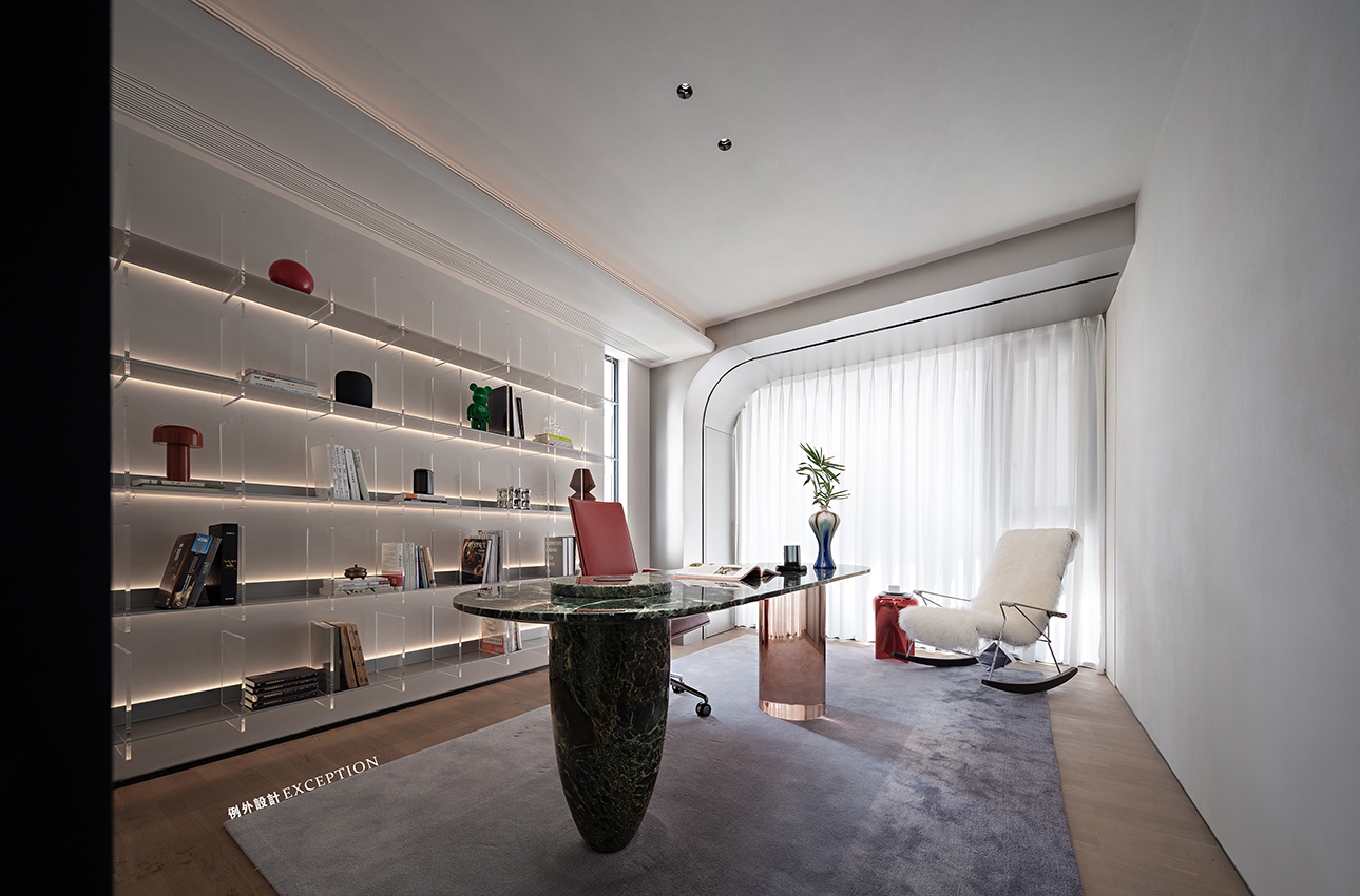 我們希望創(chuàng)造出更多和自身愉悅感受相關(guān)的東西,用溫和的姿態(tài)去發(fā)現(xiàn)生活的詩(shī)意,以多重閱讀的深度,超越幸福的想象。書房整面亞克力書架,帶來清爽的視覺體驗(yàn)。弧形玻璃磚墻和樓梯間的光線相互滲透,晚上燈光亮起來,映照出屋主伏案辦公的身影,愛人上樓遞上一杯牛奶,簡(jiǎn)單的生活影像在此刻愈發(fā)溫馨,讓人動(dòng)容。