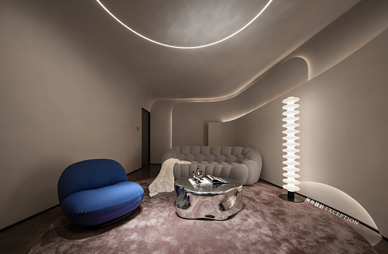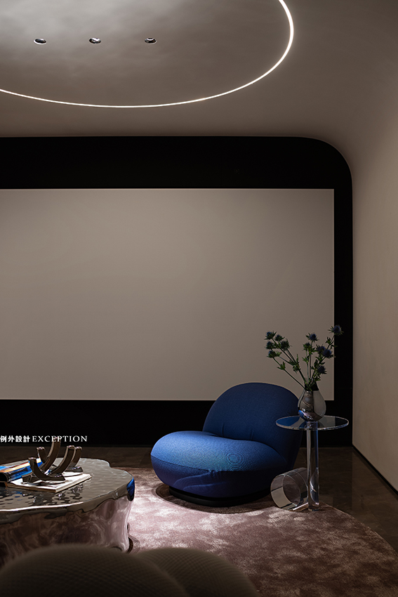影音室主要是孩子和家里的長(zhǎng)輩的休閑空間。墻地一體的設(shè)計(jì)展示出極大的包容性,在高低、內(nèi)外中塑造相互交疊的空間關(guān)系。流線型燈光對(duì)形體進(jìn)行細(xì)微的再構(gòu),墻面底部弧形鏤空增加了通透性。跳脫出傳統(tǒng)影音室千篇一律的黑與沉悶感,在一片灰白的視像中,搭配太空銀,克萊因藍(lán)和冰川灰,酷炫中又有一絲優(yōu)雅,自然而然地引導(dǎo)視覺去捕捉電影中的大千萬象。