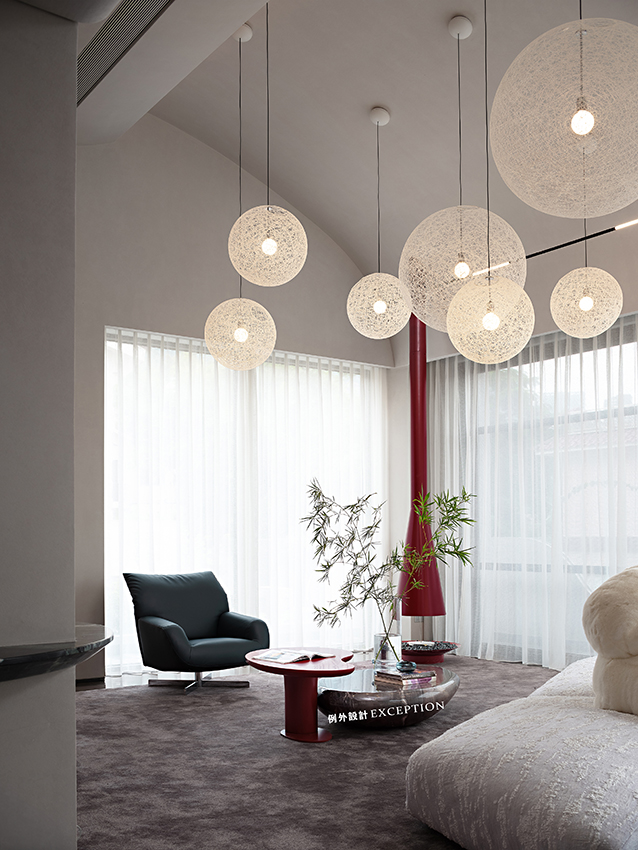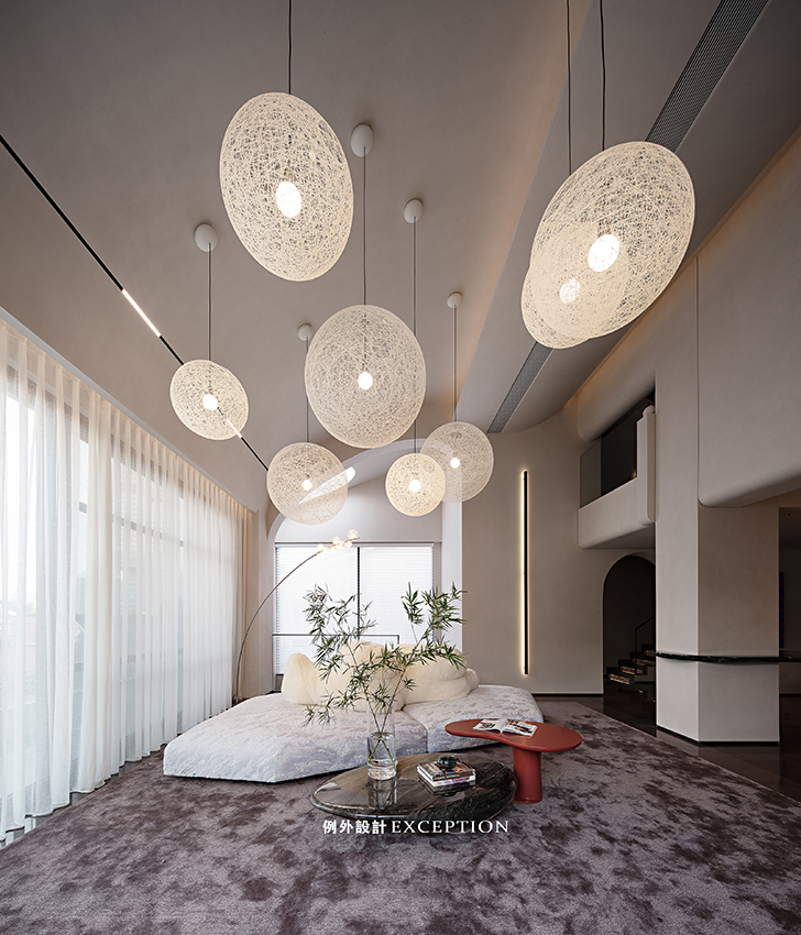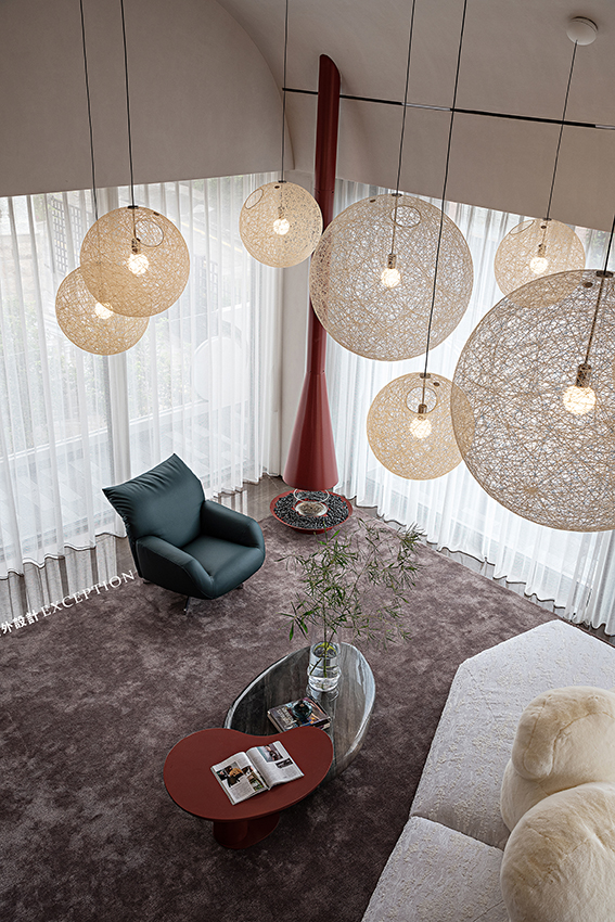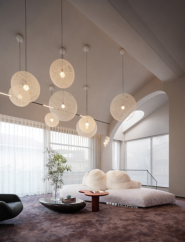 客廳利用挑空優(yōu)勢(shì)將空間格局打開,參差錯(cuò)落的球形燈如同一道神秘開關(guān),一秒時(shí)空轉(zhuǎn)換,觸達(dá)磅礴大氣的浩瀚宇宙,星河璀璨。底下edra沙發(fā)栩栩如生,底座如同漂浮的冰川,白熊似乎在仰望星空,愜意享受著空間的自然與靜謐。