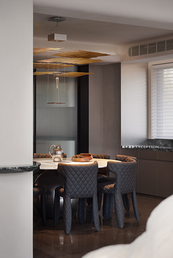 高品質(zhì)的生活源于對(duì)每個(gè)細(xì)節(jié)的用心,實(shí)現(xiàn)功能和審美的統(tǒng)合。餐廳利用原結(jié)構(gòu)柱體,定制了弧形吧臺(tái),與餐桌搭配創(chuàng)造出更多的互動(dòng)感。金箔藝術(shù)燈如同火星熾熱的表面,點(diǎn)燃對(duì)生活的熱情,成就每一次就餐時(shí)的藝術(shù)化享受。