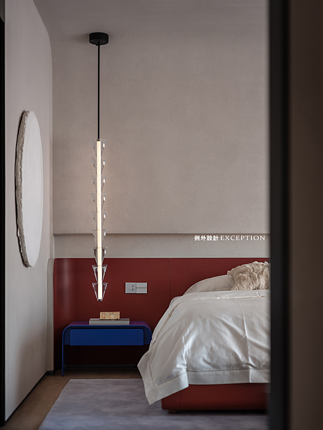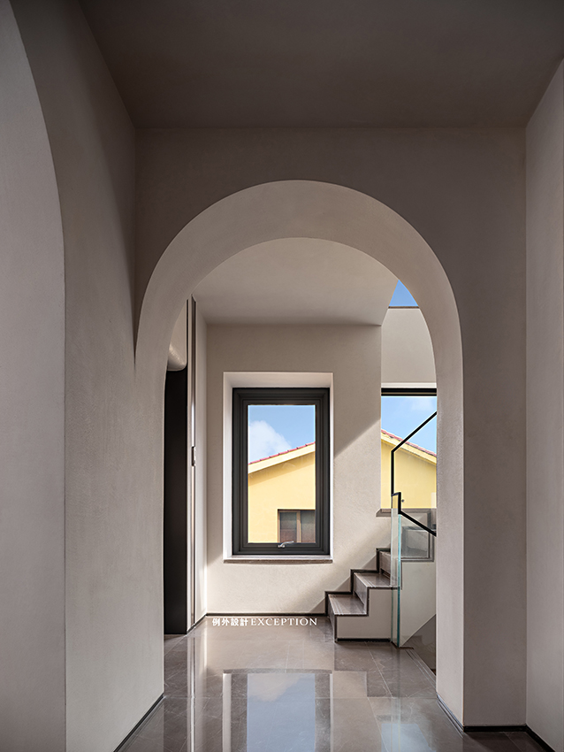 門洞的弧形處理弱化了柱體的存在,設(shè)計(jì)用借景的方法,通過不同層次的窗戶以及天窗就能看到不同的風(fēng)景,加上拱形門洞,柔化了空間感受,傳達(dá)出立體的幾何美感。置物柜上經(jīng)緯縱橫的藝術(shù)畫,有跳脫規(guī)則之外的自由之美,當(dāng)你凝視著它時(shí),仿佛也能聽到自己靈魂深處的聲音。
