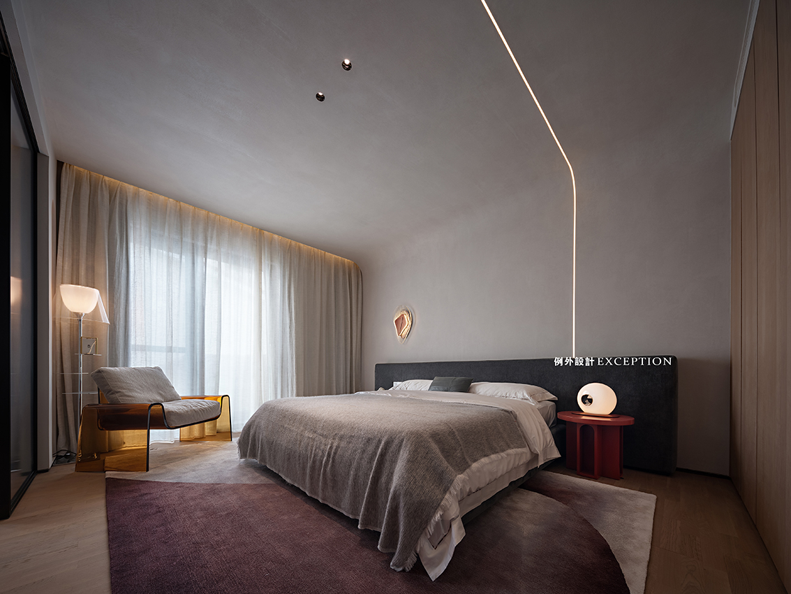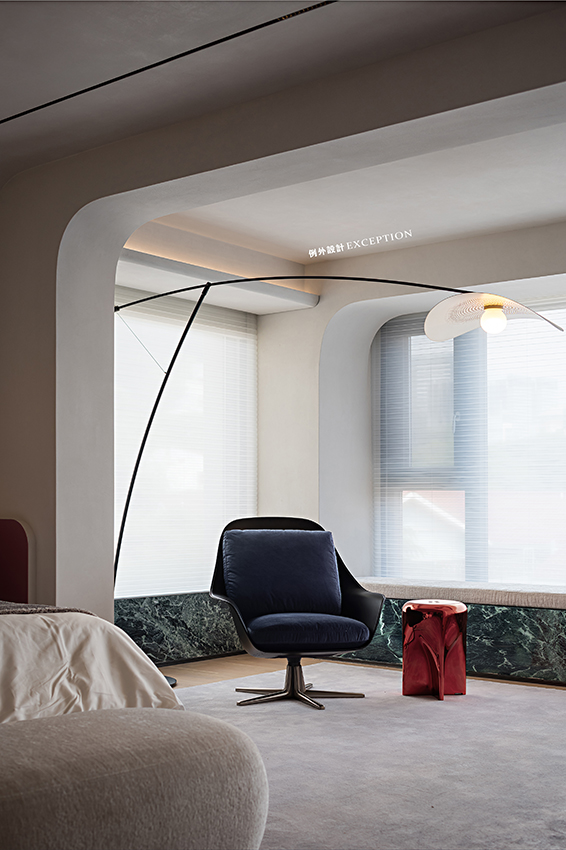 三樓主要是屋主夫妻倆的空間,包括主臥、主衛(wèi)、書房和衣帽間。主臥尺度非常舒適,睡眠區(qū)之外還做了休閑區(qū),既有單椅閱讀區(qū),也有美人榻,還有超長(zhǎng)飄窗臺(tái),互動(dòng)的場(chǎng)景可以豐富多樣。睡眠區(qū)墻面的抽象畫來自藝術(shù)家馬樹青,它可以是月亮,也可以是純粹的白色,給人無限遐想。