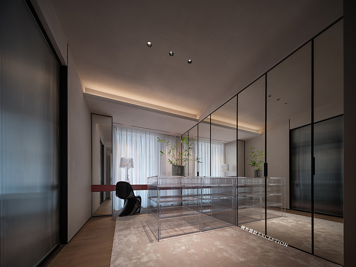 那些隱匿于空間背后的故事,在流動(dòng)的風(fēng)里,在精致有品的器物里,也在平淡有序的日子里。衣帽間做了大量的全身鏡,里面是衣柜,配合玻璃柜門的衣柜,實(shí)現(xiàn)功能和美學(xué)的雙重享受,亞克力島臺(tái)為穿搭時(shí)刻提供了最直觀的選擇,每天的精神風(fēng)貌都是鮮活而獨(dú)特的。