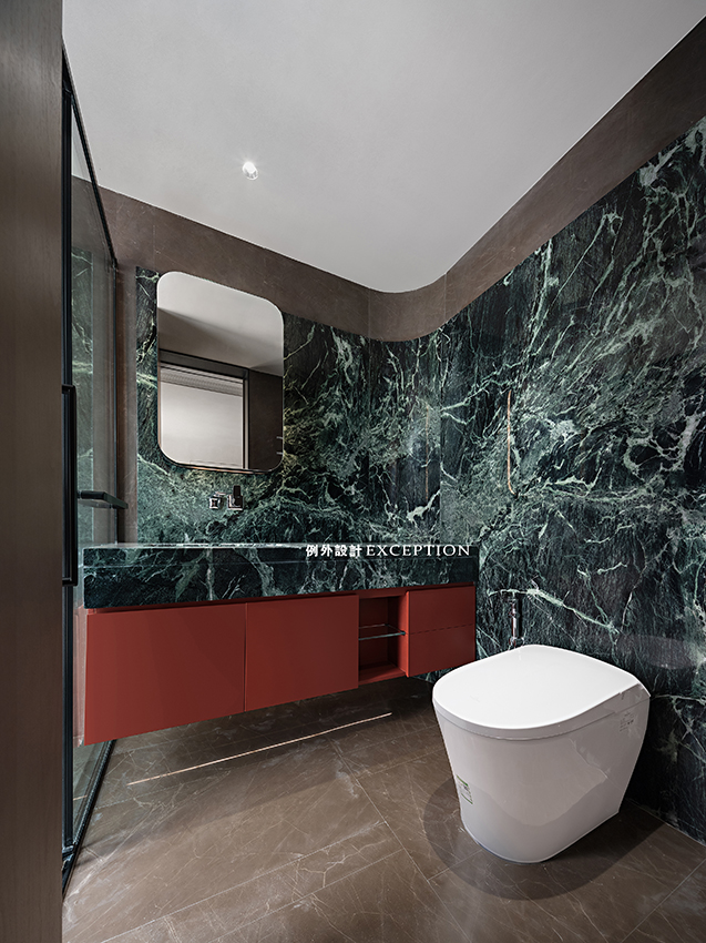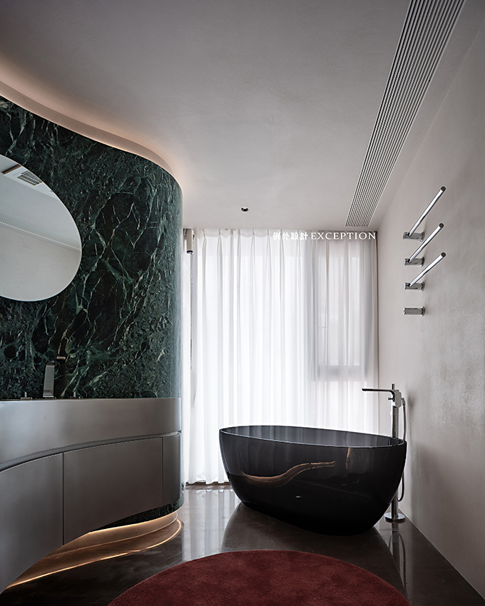 整體的弧形造型弱化了柱體的影響,空間是流動(dòng)的,大理石背景上鑲嵌了異型的鏡柜,和設(shè)計(jì)師定制款純不銹鋼臺(tái)面搭配起來,一氣呵成,視覺上形成一種動(dòng)態(tài)有力的美感。一幅小畫成為空間的視覺焦點(diǎn),弧線與靈動(dòng)的色彩協(xié)同敘事,在明亮通暢的空間里留下頗具藝術(shù)感的氛圍,是屬于屋主特有的生活品位。