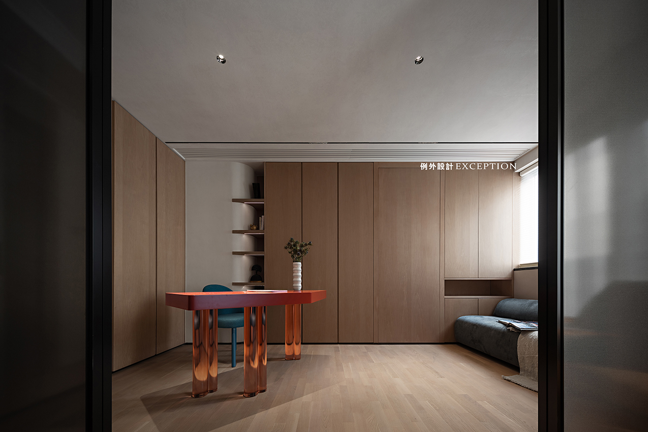 書房琥珀色書桌呼應(yīng)睡眠區(qū)同色單椅,在低調(diào)的米灰空間融入絲絲入扣的溫暖氣息。看似不經(jīng)意的配搭,一切都渾然天成。