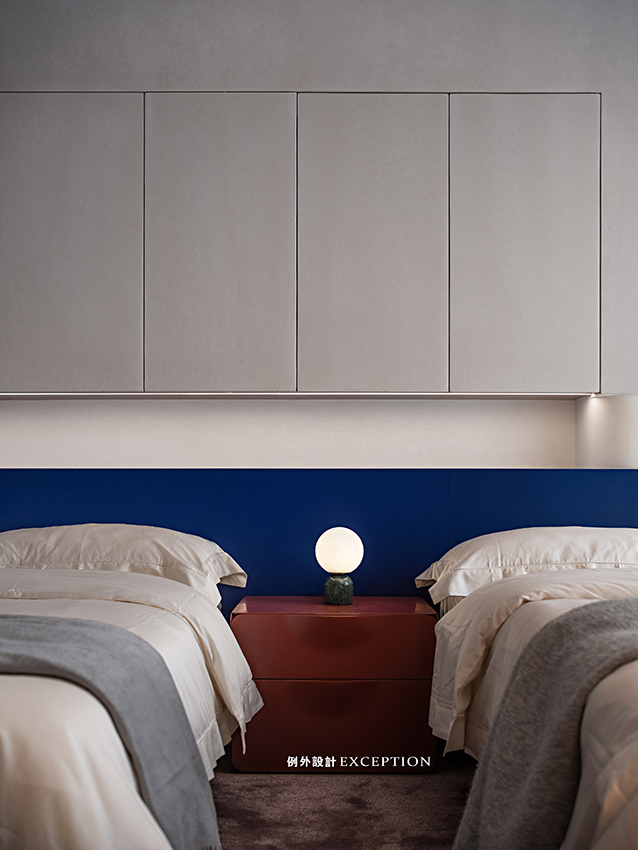 長(zhǎng)輩房雙床配置,是對(duì)彼此的關(guān)愛和互不相擾。在軟裝的配設(shè)上以極簡(jiǎn)為主,陽(yáng)光透過玻璃在床屏上留下溫暖的痕跡,空間靜謐優(yōu)雅。