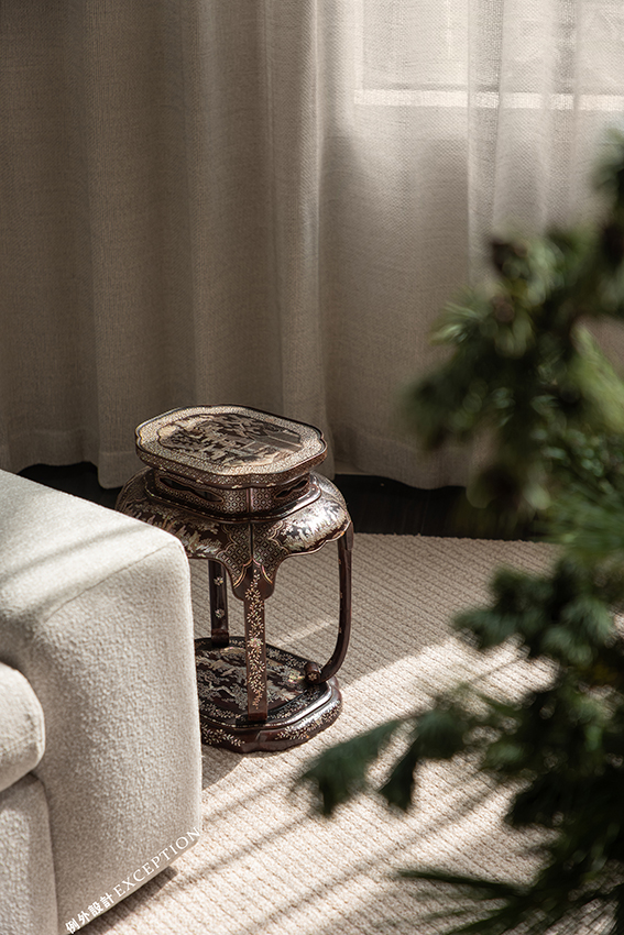 博物館殿堂級的鎏金古董桌成為中島,無需傳統的衣帽間,隨手拿取間彰顯出居者的生活態度,在家的維度中尋覓治愈的力量。