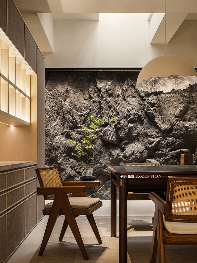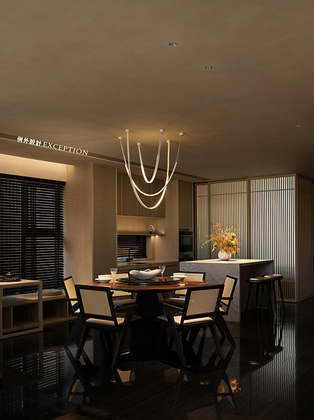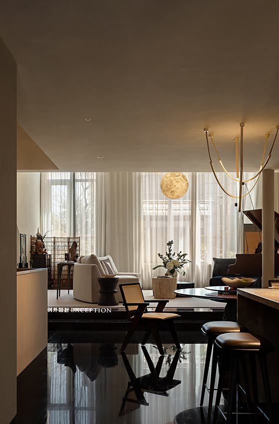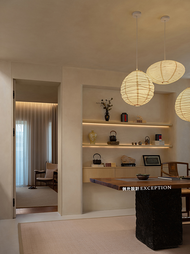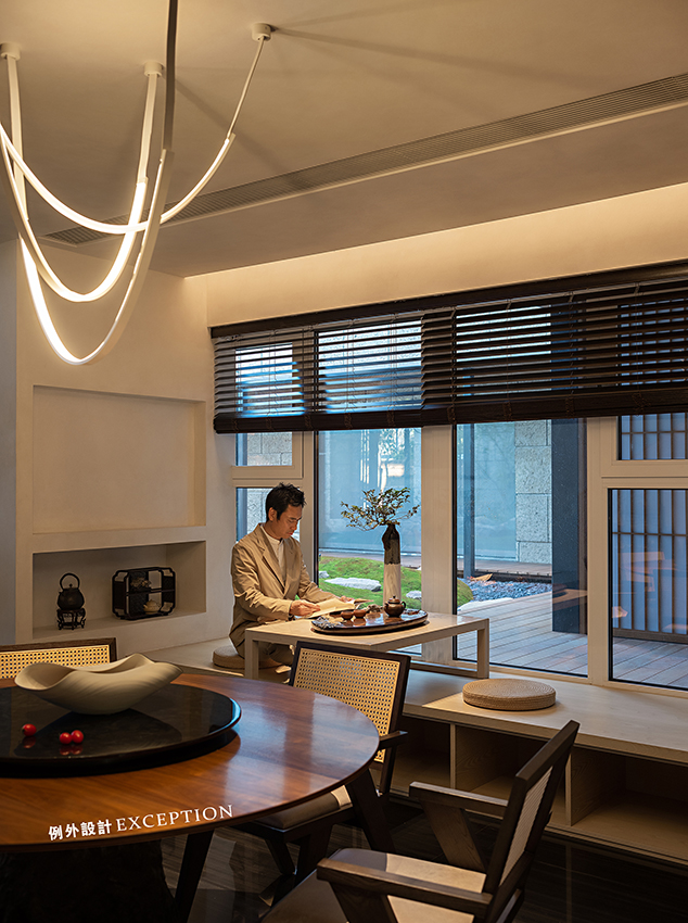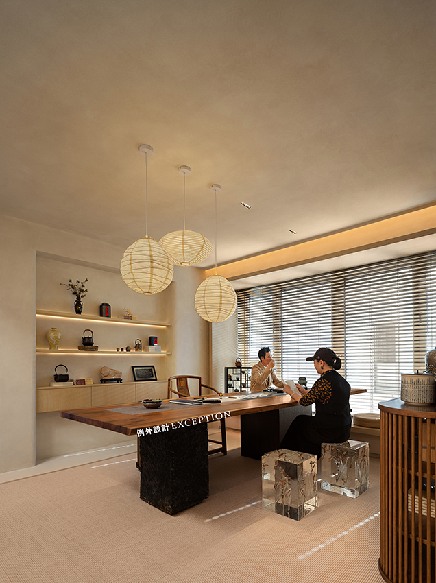鴻藝源&例外設計以藝術涂料和實木材質定下空間的硬裝基調,柔和溫暖,包容性強。四時的園林景觀透過橫窗和格柵,將清雅和生機引入室內,讓心靈隨時都充盈著極致的閑適。