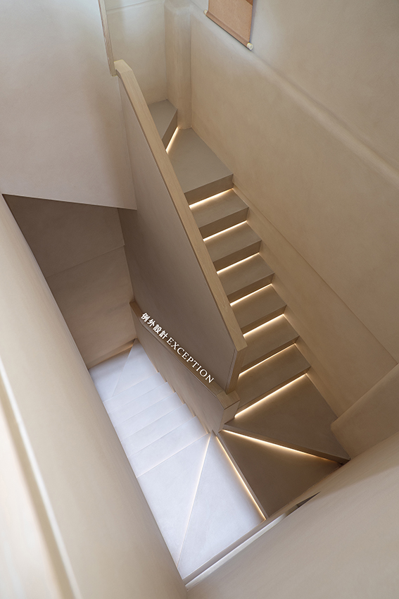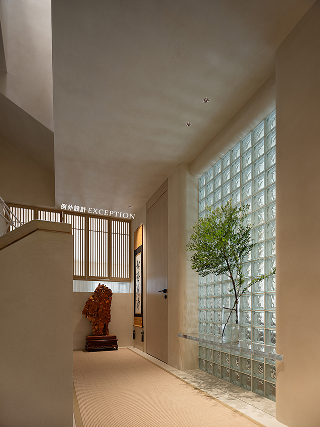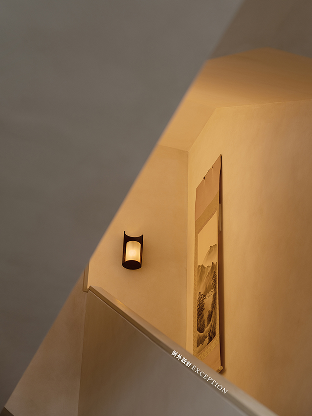樓道是聯通不同風景的橋梁,拾級而上,拐角處都有一幅屋主珍藏的畫作,勻凈的燈光渲染出樸拙高遠的意蘊,視線稍作停留,也會獲得漫步山水之中的禪意享受。
