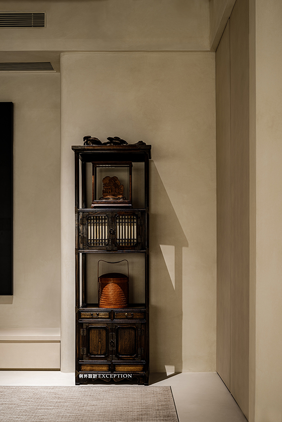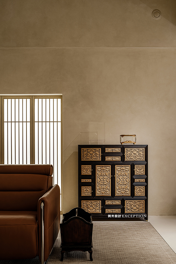 光線欠佳的地下室,設計師加入格柵窗和透光處理,引光入景,豐富了空間的層次。木質、灰泥、天然石材和器物收藏,強化了靜謐古雅的語境,讓人處于其中,身心和洽,靈韻悠悠。