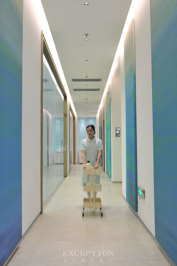 有人說,美,是尋找一種平和。對稱設立的隱藏光帶實是設計師在空間中不斷探討的平衡法則,以此傳遞出沉靜穩妥的安全之感。單調的白色墻壁未免過于冷清慘淡,于是巧用硬包版畫進行裝飾,當溫潤的藍漫延過整條走廊,仿佛漸變的天空般澄澈爽朗。