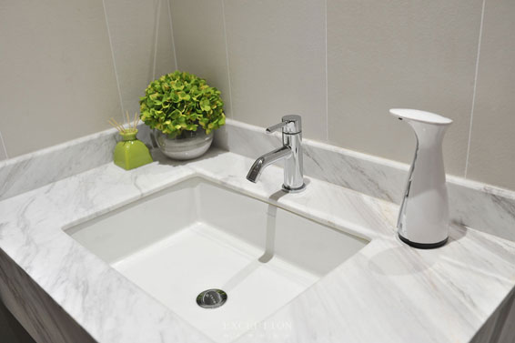 淋浴室,簡約現代家私搭配素凈的顏色,白與藍和諧配比帶來最柔和的視覺感受,塑造干凈健康的環境氛圍,讓媽媽們得以在最安心的環境下完成梳洗。