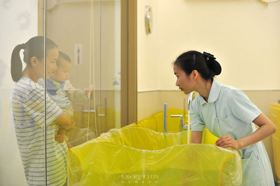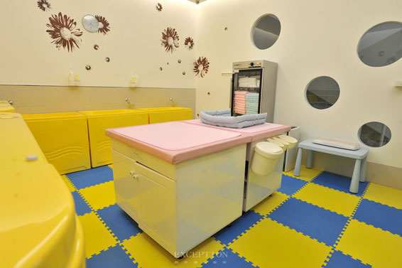 鮮艷的色彩對新生兒有一種強烈的吸引力,能夠刺激新生兒對色彩的辨識能力,設計師選取檸檬黃和天空藍作為嬰兒游泳撫觸室的主色調,貼近自然的顏色把空間裝點得空間活潑清爽,圓潤的家私邊角處理貼心的避免了磕碰危險,保障新生兒安全。