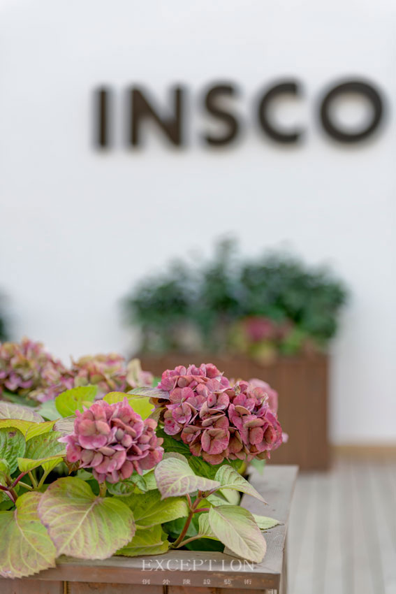 綠意深處,白墻上的字母浸潤著低飽和度的咖啡色,依據特有的豐富內涵進行奇妙的組合,便是Insco所帶來的柔和視覺體驗。