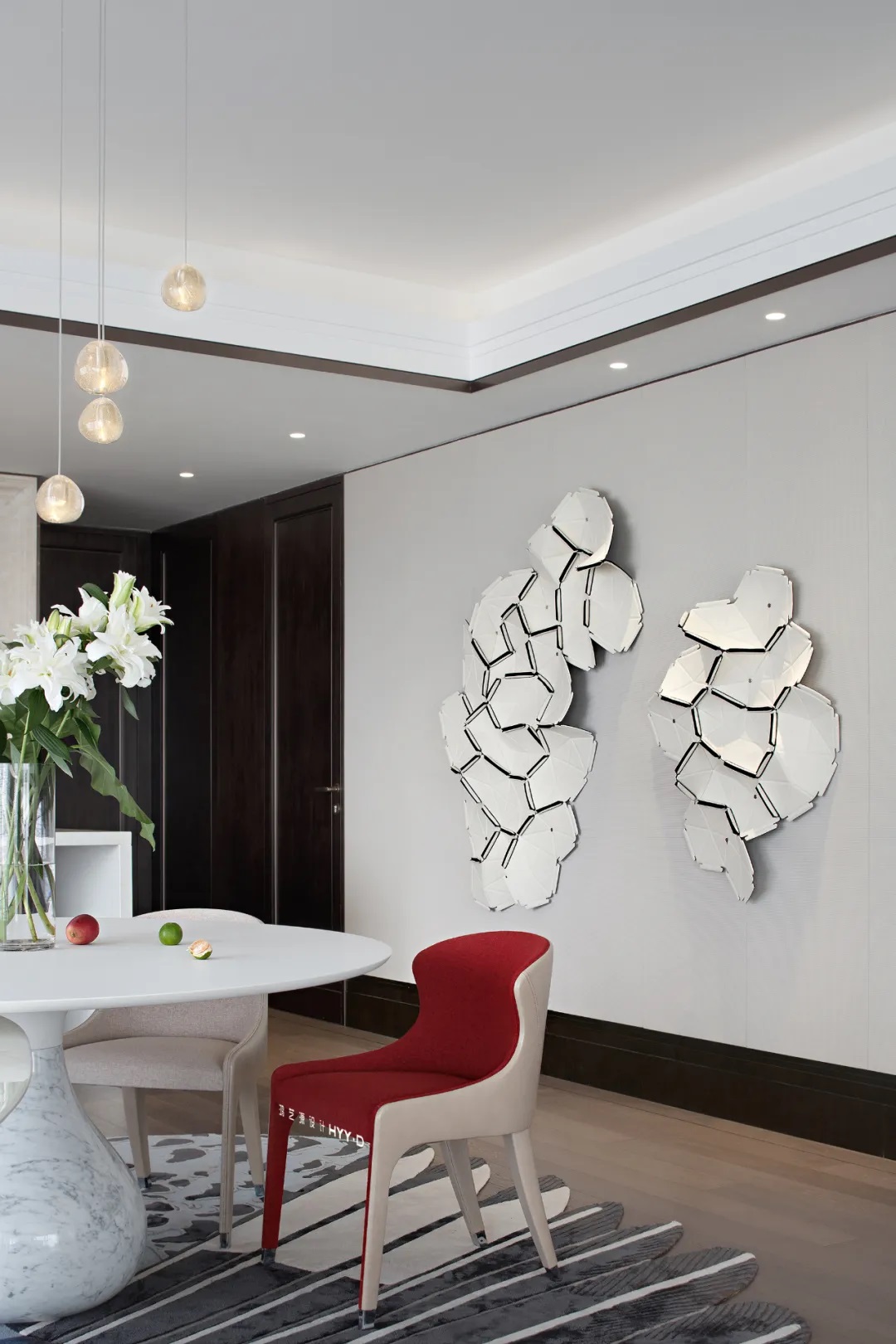 提起春天,耳畔會吹來調(diào)皮玩耍的風(fēng),風(fēng)清日好的天氣里,花香撩撥鼻尖的時刻,也會想起野餐食味的樂趣。美好的自然風(fēng)物總是帶來幸福的靈感,于是在家的構(gòu)想中,餐廳模擬鳥類羽毛的地毯,水滴形餐桌讓人聯(lián)想雨絲的溫柔,云朵掛飾輕盈變幻,瞬間把人的思緒帶入享受美食的情景中,以春日為佐,飲卻自然繁華。