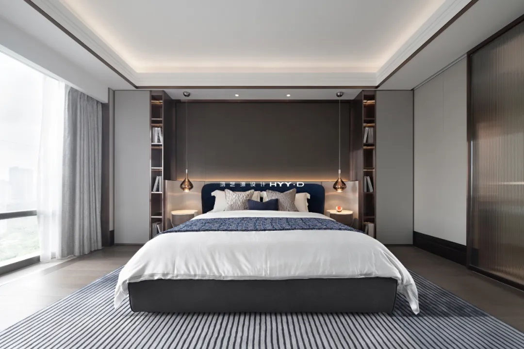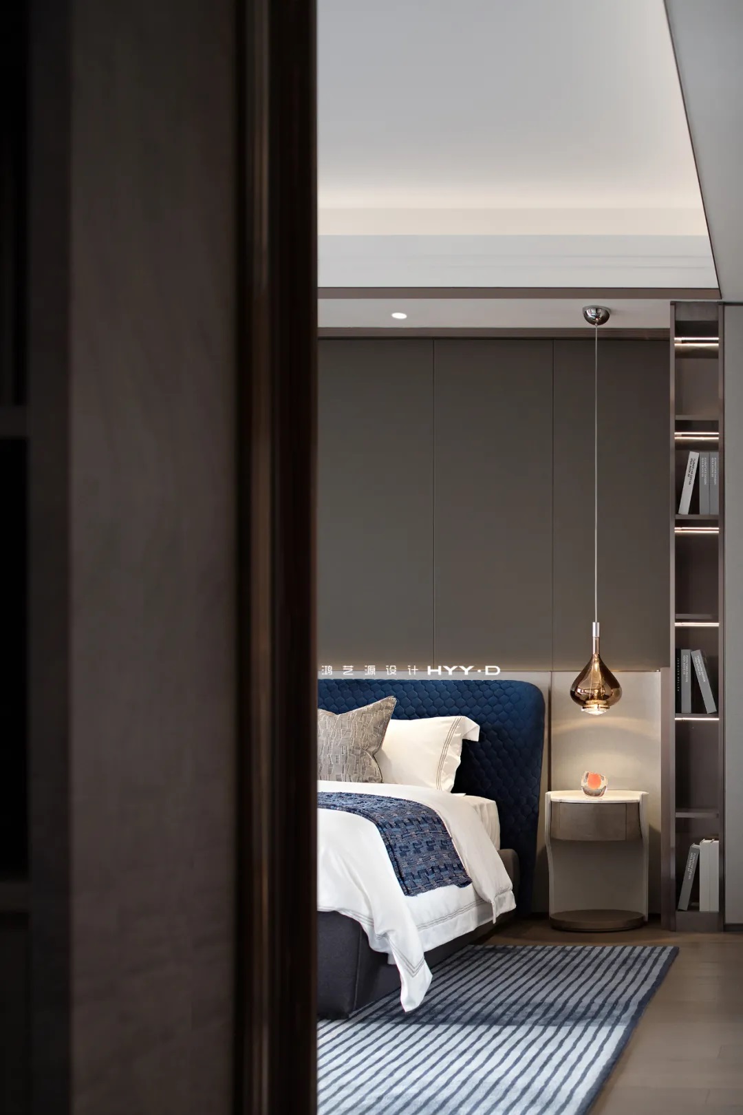 主臥在原有硬裝的基礎(chǔ)上增加了收納柜,可以隨手拿取喜歡的書籍,也可以珍藏世界各地旅行的回憶。增加了生活情調(diào)的同時,也慢慢發(fā)現(xiàn)更好的彼此。金屬與棉麻的配搭,藍(lán)色與橙色的碰撞,抬眼望向窗外的那一刻,室內(nèi)的奢雅與自然的靜美達(dá)到了平衡舒適的境地。