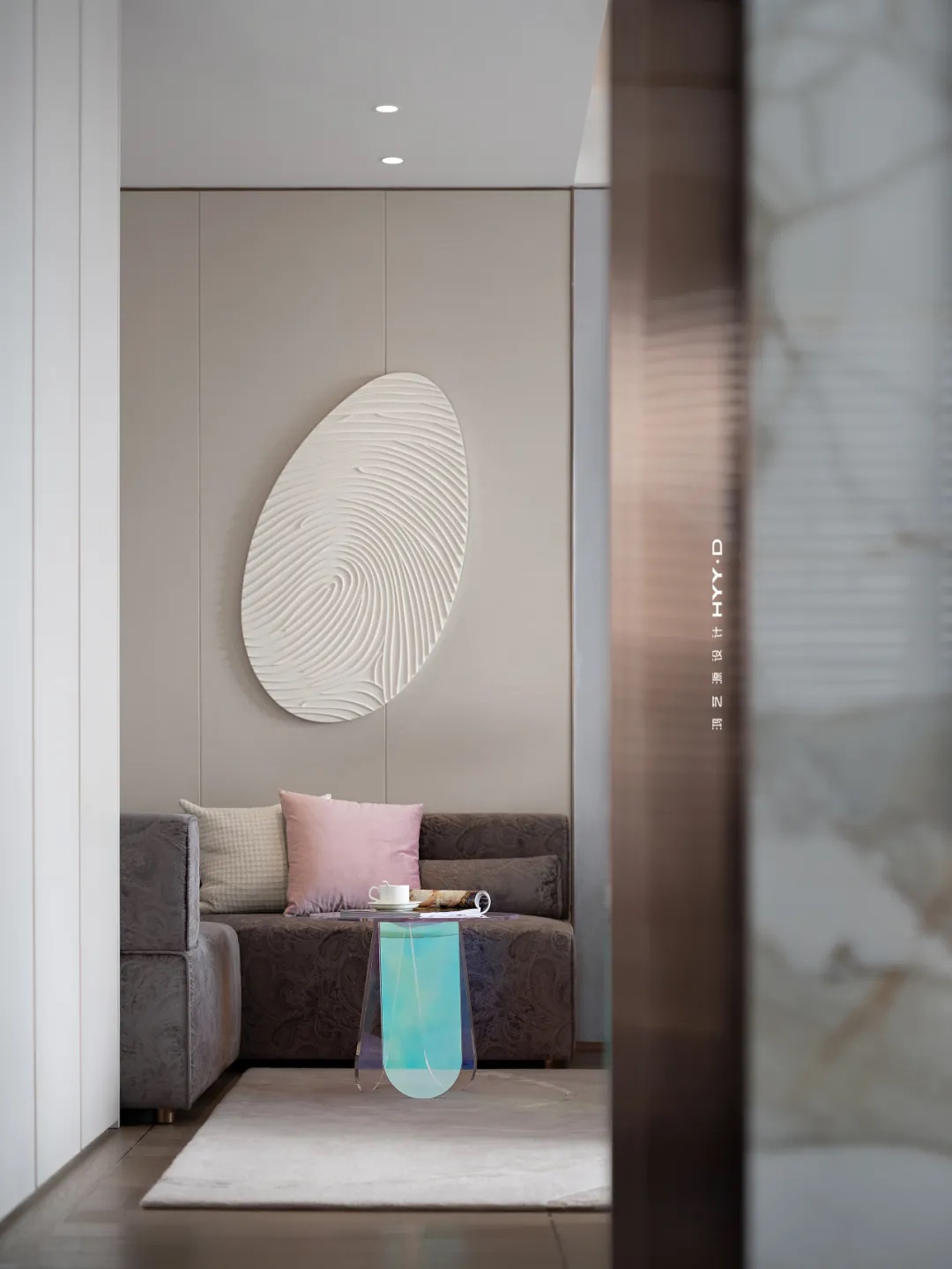 空間的自由是設(shè)計師需要考慮的重要課題,是居者想象力與審美品調(diào)的自由,粉得柔美,白得純凈,是00后小仙女夢想中的小世界。當(dāng)被問及最喜歡哪個空間時,她笑容洋溢地給出了答案:臥室。那幅定制的指紋畫便是她最個性的展現(xiàn),與一旁的橢圓妝鏡遙相呼應(yīng),不同的材質(zhì)混搭,最終通往內(nèi)心對美好生活的熱愛。