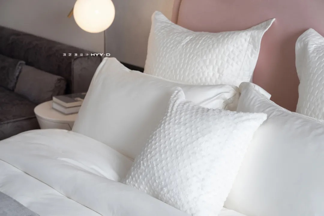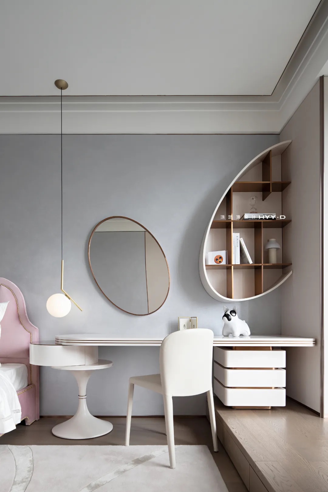 從踏入房間的那一刻起,腦海里便浮現(xiàn)了多功能的生活場景,視線和思緒都變得柔軟起來。軟飾上選用象牙白、浪漫粉、月光灰,融入幾何美學(xué),彰顯女孩的柔美爛漫,讓人如沐春風(fēng),閨蜜小聚、閱讀閑聊,觀景休憩,功能和情感之外,設(shè)計創(chuàng)造了額外的思考空間陪伴成長。